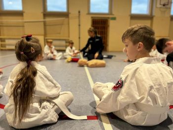 Podczas zajęć mundurowa zaangażowała wszystkich młodych sportowców do praktycznego sprawdzenia zdobytej wiedzy. Dzieciaki mogły poćwiczyć swoje umiejętności na fantomie, układały również swoich kolegów z grupy w pozycji bezpiecznej ustalonej. Młodzi karatecy uczyli się także wzywania służb ratunkowych, przekazywania ważnych informacji na temat poszkodowanego oraz miejsca zdarzenia. Warsztaty cieszyły się wśród dzieci sporym zainteresowaniem, o czym świadczyły liczne pytania związane z udzielaniem pierwszej pomocy oraz sytuacjami z jakimi policjanci spotykają się w codziennej służbie.