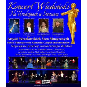 bilety: Artyści Scen Wrocławskich zapraszają na Koncert Wiedeński "Na Urodzinach u Straussa". 90 minut wspaniałej zabawy!!! Na 25 października 2025 przypadają dwusetne Urodziny Johanna Straussa. To znakomita okazja aby zorganizować muzyczną ucztę na cześć "Króla walca". Wśród urodzinowych gości znajdzie się operetkowa arystokracja: Książę czardasza Emmerich Kalman czy mistrz lirycznego walca Franciszek Lehar. Niczym karnawałowe serpentyny wić się będą najwspanialsze melodie, które urzekły cały świat:
