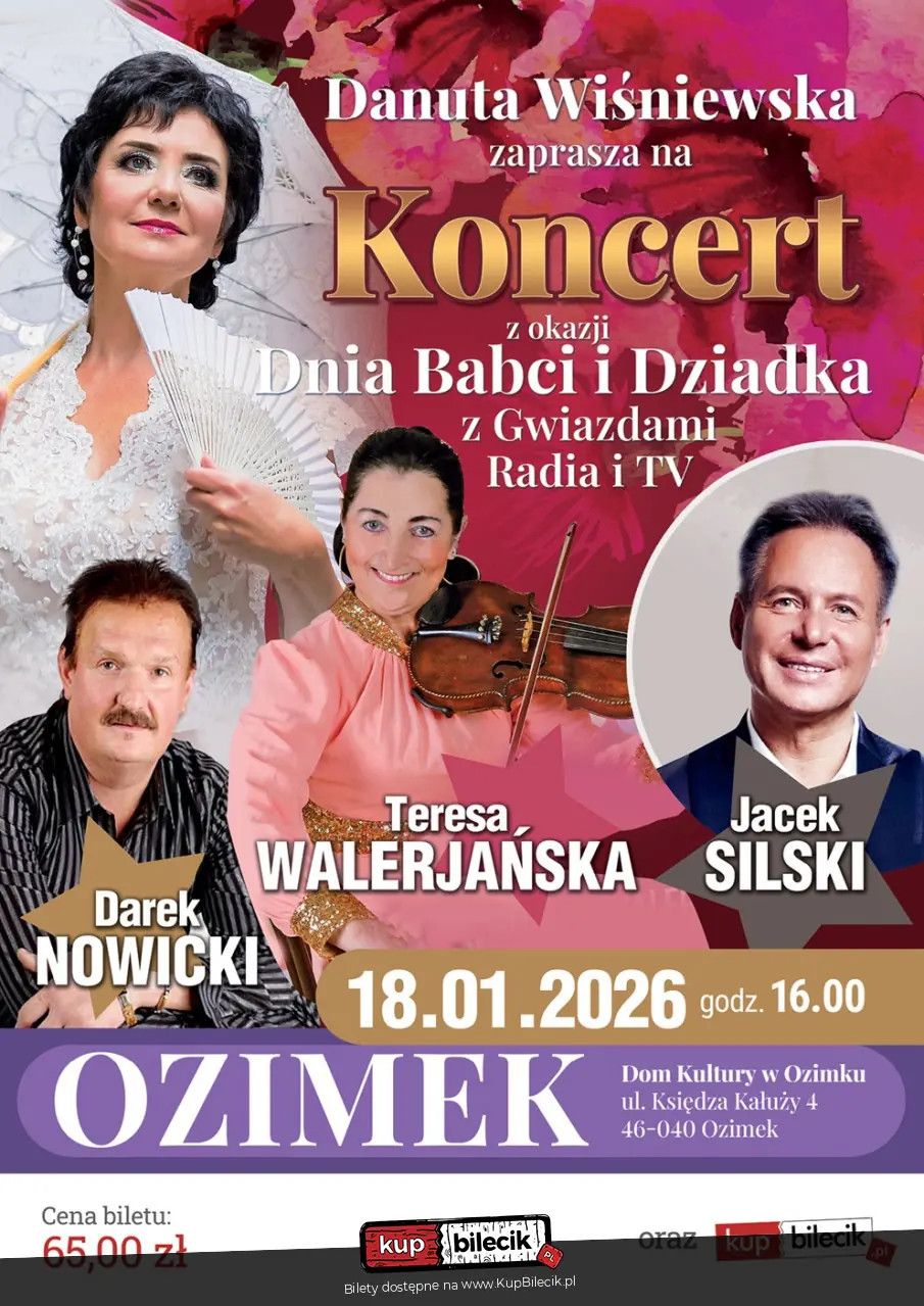 bilety: Dzień Babci i Dziadka z Gwiazdami Radia i TV, to barwny, niepowtarzalny koncert przepełniony pięknymi strojami, znanymi Państwu utworami z radia i telewizji, a przede wszystkim wspaniałą atmosferą i dużą porcją humoru! Czeka na Państwa najbardziej lubiana przez Publiczność muzyka szlagierowa, prezentowana przez dobrze znanych naszej Publiczności Wykonawców: - Danutę Wiśniewską, która zaprezentuje Państwu również utwory ze swojej nowowydanej 2.płyty solowej "Nasza Moc" oraz Jaceka Silskiego, którego utwory nieustannie goszczą na antenach regionalnych rozgłośni radiowych, telewizji regionalnych i telewizji TVS. Wiele piosenek odniosło duże sukcesy w radiowych listach przebojów jak np. uwielbiane przez Państwa" List z morza", "Cicha noc," "Aniele" i wiele innych, które usłyszymy tego wieczoru. Cały program to wyśmienita zabawa, wspólny śpiew, niespodzianki dla naszej wyczekiwanej Publiczności nie tylko tej najstarszej generacji! Duża porcja humoru! W przerwie koncertu będziemy mieli niepowtarzalną okazję do wspólnych zdjęć z naszymi Artystami, wymiany wrażeń koncertowych oraz kilku słów z naszymi gośćmi, a kto zechce otrzyma również kartkę z autografem! Bilety do nabycia na: KupBilecik.plDanuta Wiśniewska artyści: Danuta WiśniewskaDanuta Wiśniewska - to była solistka zespołu "Śląsk". O niespotykanym talencie wokalnym. Jej solowe piosenki odnoszą spore sukcesy w rodzinnych mediach i na listach przebojów. Zawsze czuła ogromną więź z pieśniami zarówno śląskimi jak i niemieckimi. Popularne piosenki to Dziękować warto i Najdroższa Mamo. Bilety do nabycia na: KupBilecik.pl |
